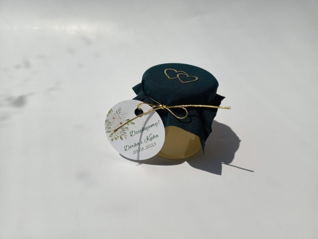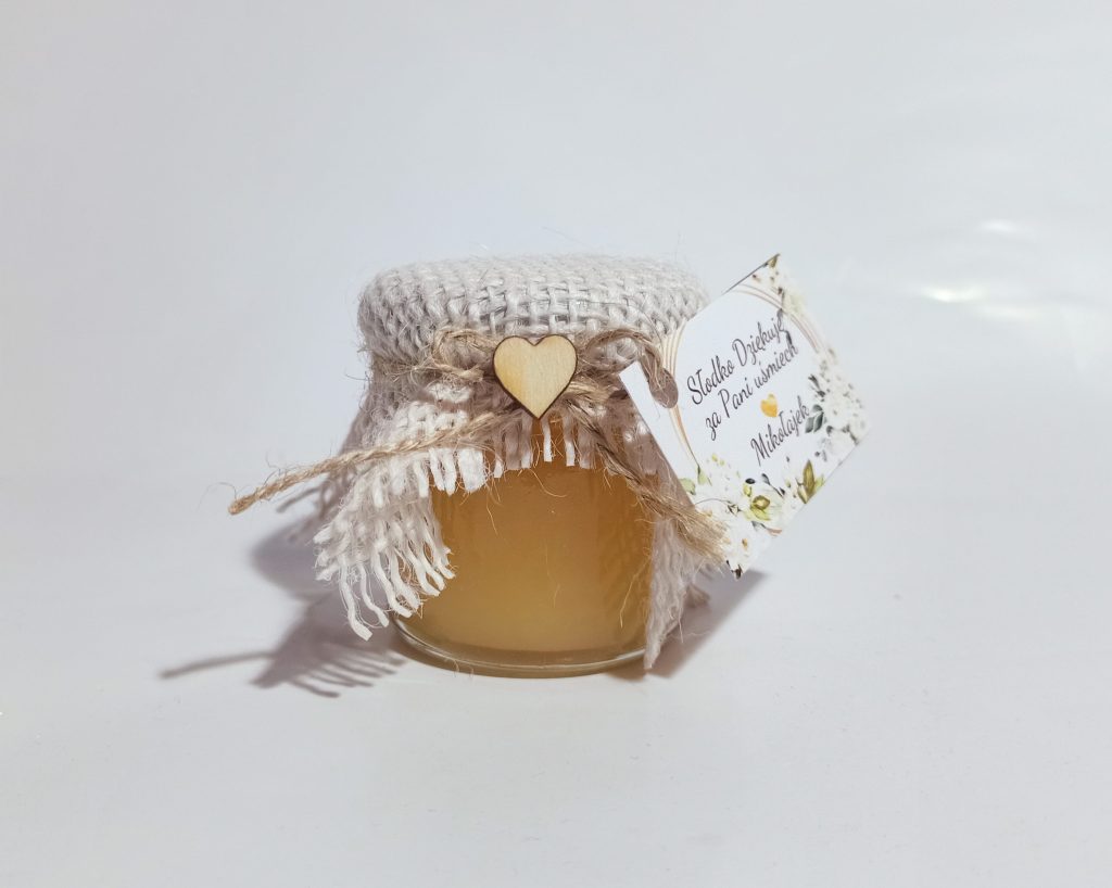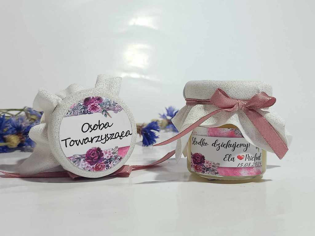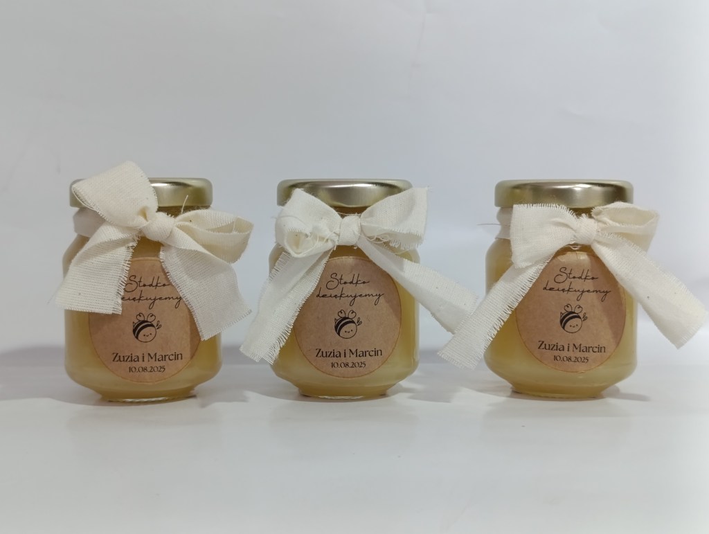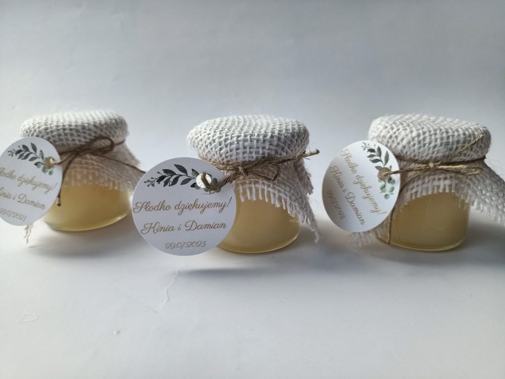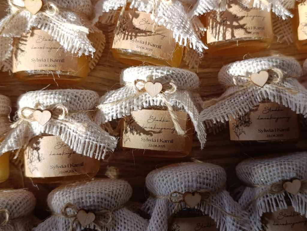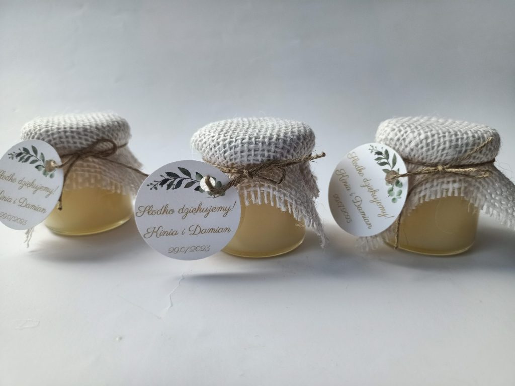 Małe, urocze słoiczki miodu, które są idealnym upominkiem na podziękowanie dla gości weselnych, klientów czy uczestników wyjątkowych wydarzeń.