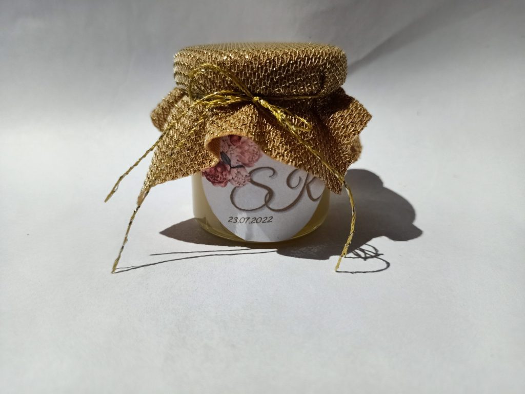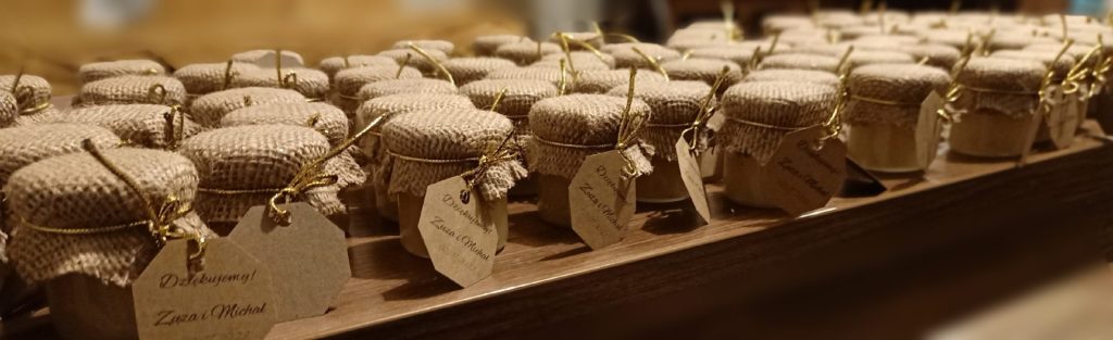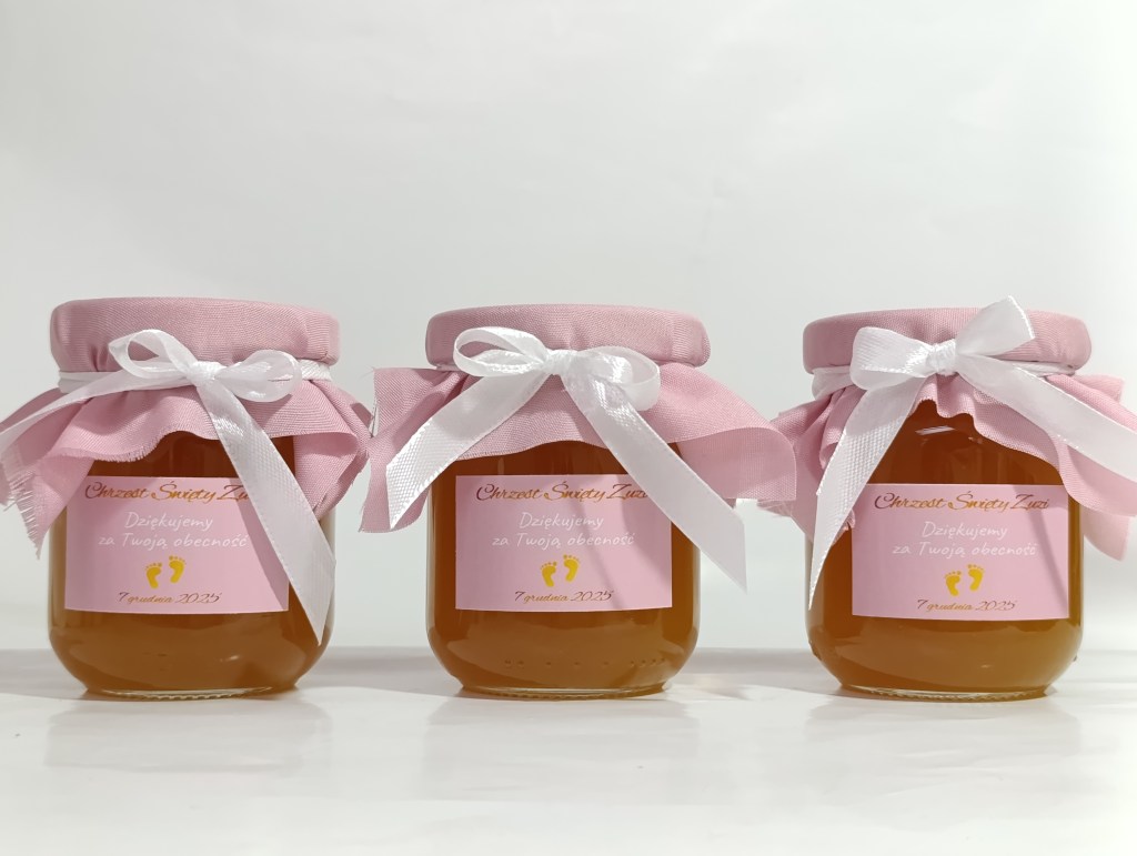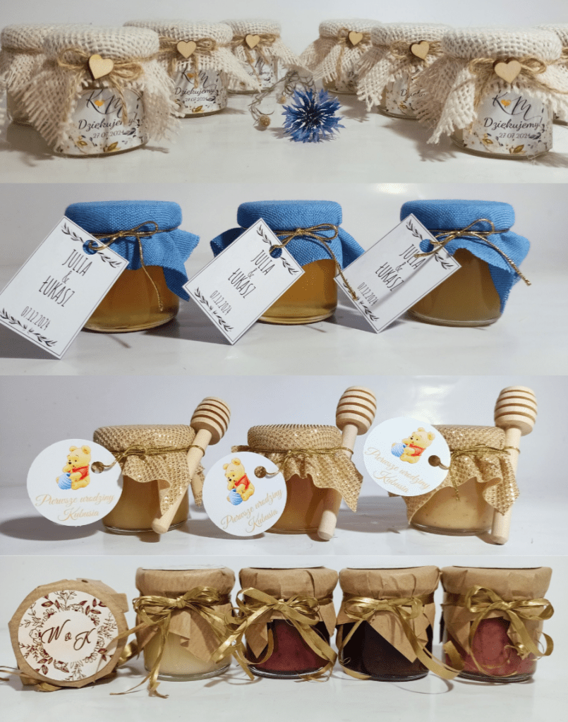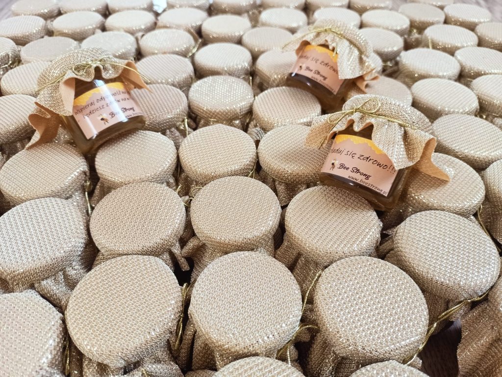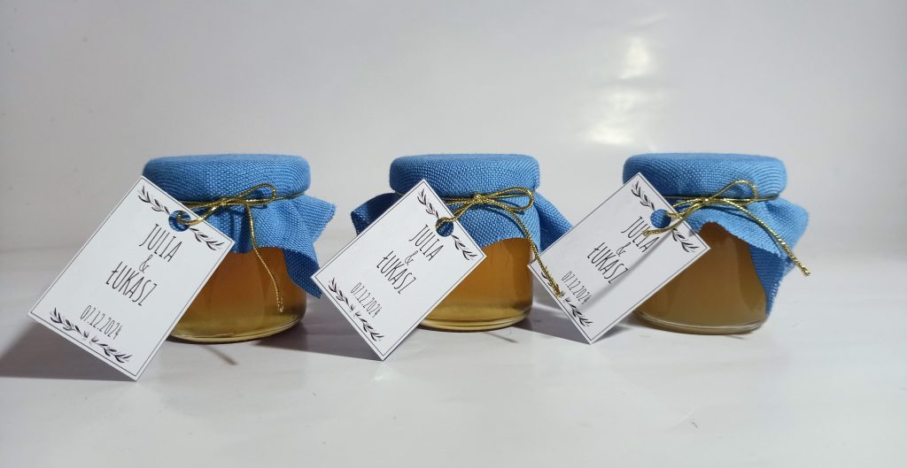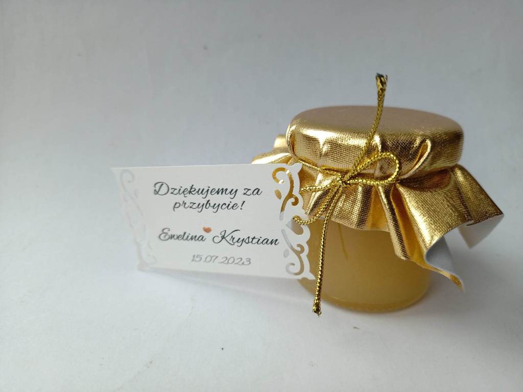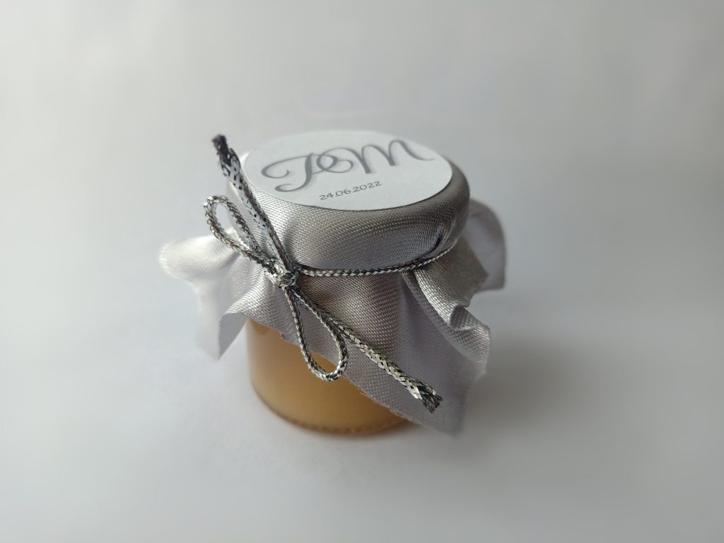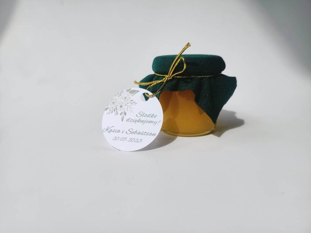 Małe, urocze słoiczki miodu, które są idealnym upominkiem na podziękowanie dla gości weselnych, klientów czy uczestników wyjątkowych wydarzeń.