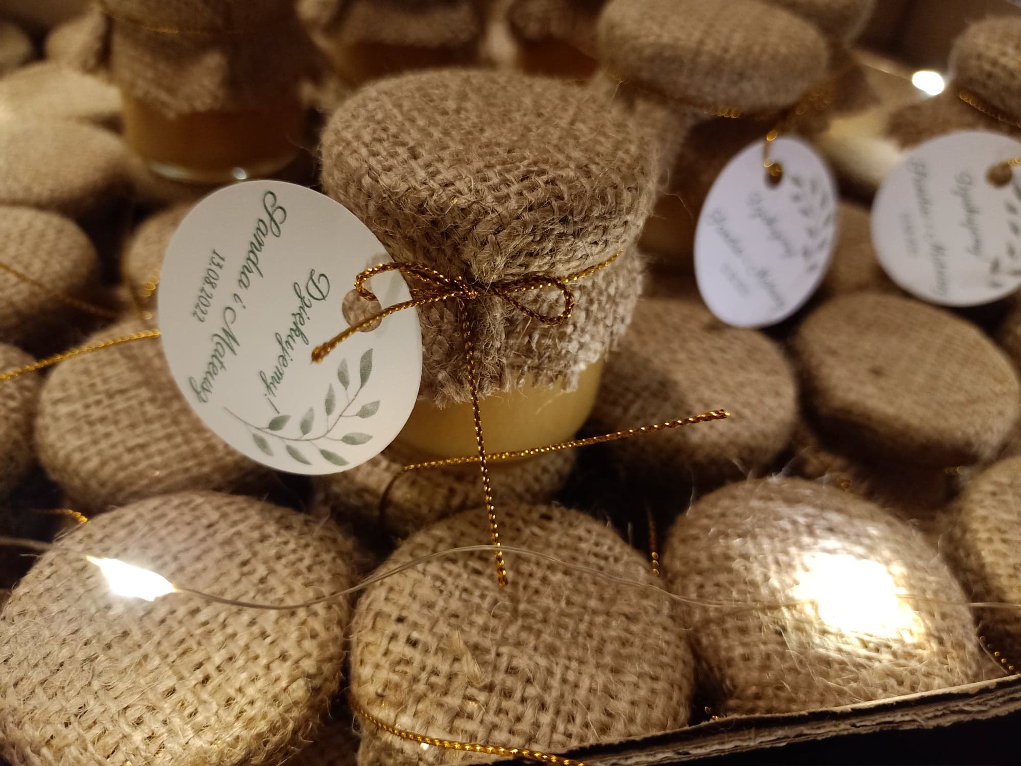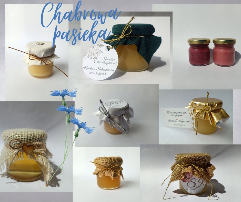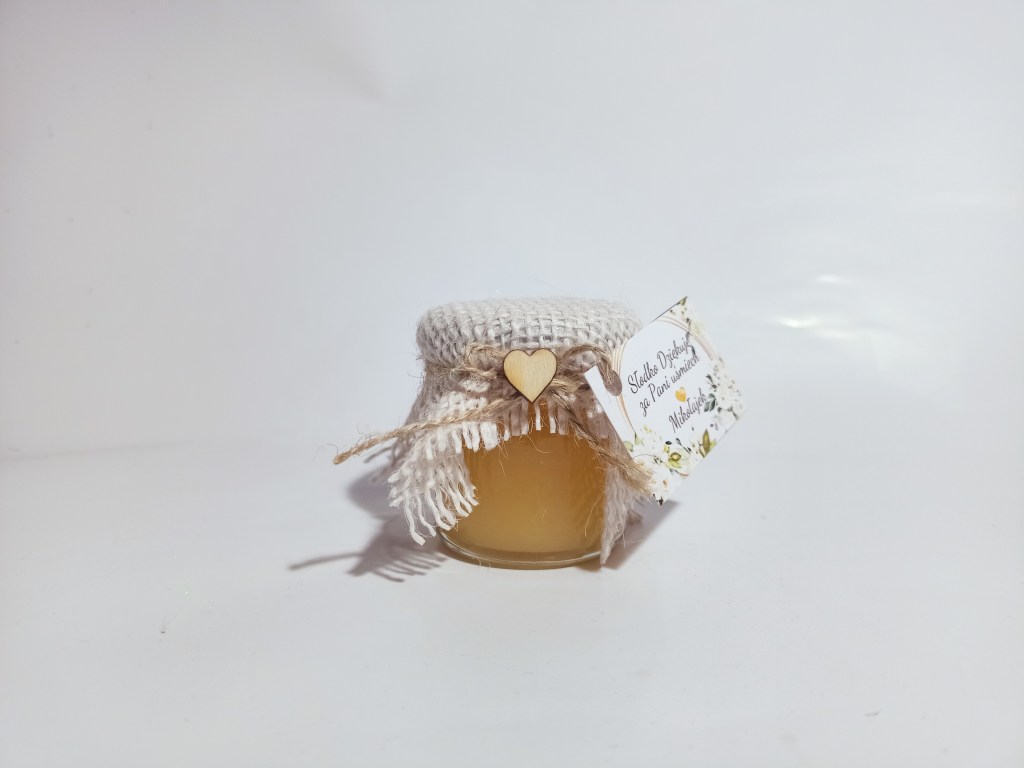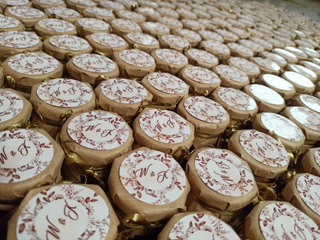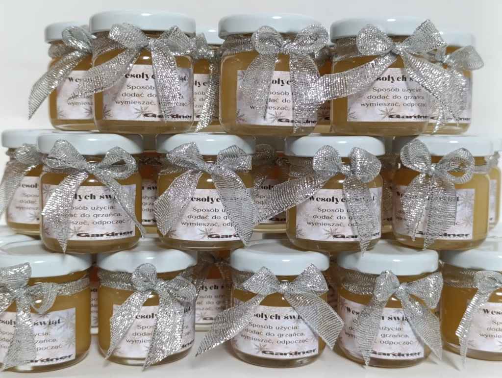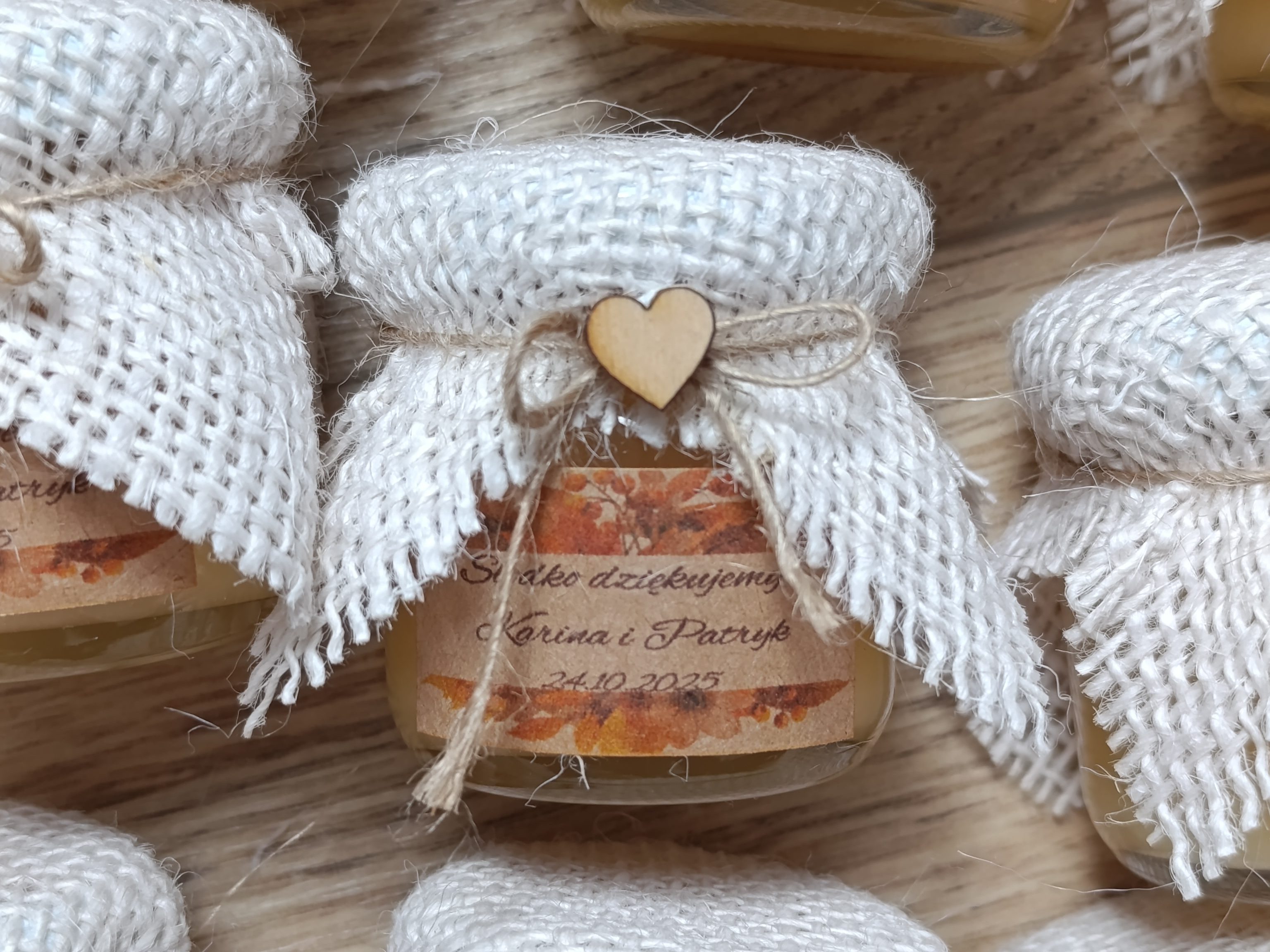 Małe, urocze słoiczki miodu, które są idealnym upominkiem na podziękowanie dla gości weselnych, klientów czy uczestników wyjątkowych wydarzeń.